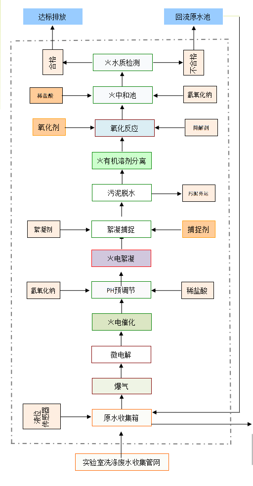 設(shè)備采用“原水收集箱→爆氣→微電解→電催化→PH預(yù)調(diào)節(jié)→電絮凝→絮凝捕捉→污泥脫水→有機(jī)溶劑分離→氧化反應(yīng)→中和池→水質(zhì)檢測→達(dá)標(biāo)排放”工藝進(jìn)行處理。